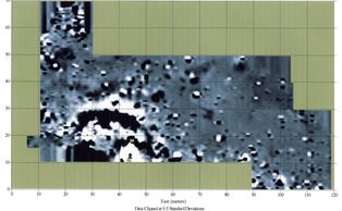 This image shows the 1622 Falling Creek Ironworks Furnace investigated by magnetometry. The concentration of black & white bands at the lower left show the furnace location.